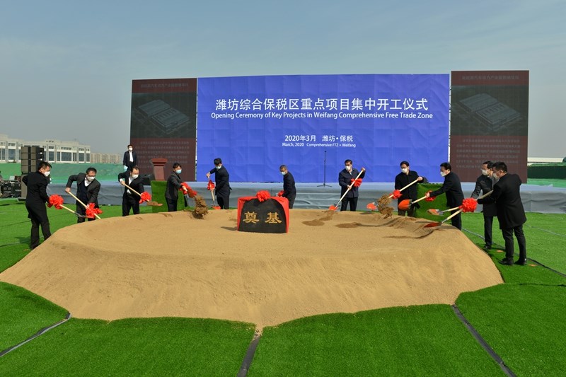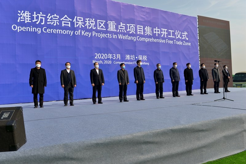 On the morning of March 12, 2020, the intensive groundbreaking ceremony of key projects in the Weifang Comprehensive Bonded Zone was held at the site of the Dana project in the new energy vehicle power industrial park contracted by the group company. Liandong U Valley Weifang International Enterprise Port, Human Resources Industrial Park, Chentao Marine  The four projects of the Bio-Health Products and Shenghe New Material Industrial Park started construction simultaneously in their respective locations.  Xu Pengqiang, chairman of the group, attended the groundbreaking ceremony.  Leaders and guests attending the event included: Wang Haiming, the leader of the "Four Advances" working group sent by the province, the second-level inspector of the Provincial Development and Reform Commission, Shi Mingkui, deputy secretary of the Party Working Committee, the leader of the “Four Advances” working group of the Municipal Bonded Zone, and the Municipal Supervisory Committee  Member Zhang Jie, Deputy Secretary of the Party Committee of Shandong Animal Husbandry and Veterinary Vocational College Zhang Shaoqiu, member of the Weifang Comprehensive Bonded Zone Party Working Committee and deputy directors of the management committee Zhang Hua, Yang Deqiang, project investor representatives, leaders of relevant departments in the bonded zone, and employee representatives of the Group's Second Construction Company.