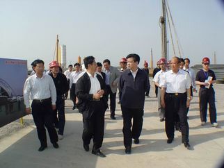 2008年5月5日下午,許立全市長視察建設中的奧體中心工程。董事長徐鵬強(上圖左一)陪同視察。 |