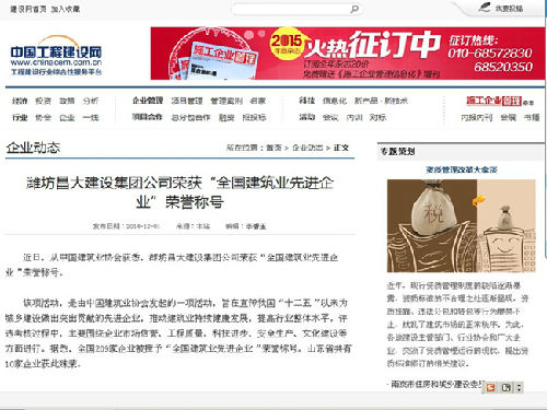 濰坊昌大建設(shè)集團榮獲“全國建筑業(yè)先進(jìn)企業(yè)”榮譽稱號——中國工程建設(shè)網(wǎng)“企業(yè)動態(tài)”2