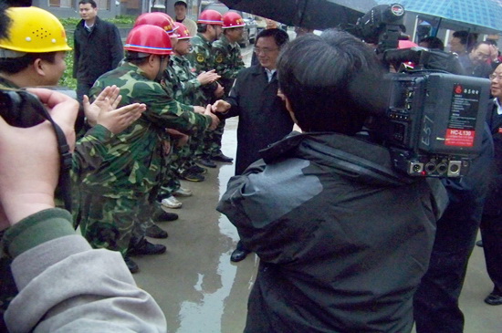 4月13日下午,春雨綿綿,中共中央政治局常委、中央紀律檢查委員會書記賀國強在有關人員陪同下,冒雨視察了北川新縣城援建工作。在集團公司援建的溫泉一期安居房工程現(xiàn)場,賀國強走進住宅樓實地察看已經建好的新居,非常高興,對山東省濰坊市援建的安居房工程給予很高的評價,贊揚山東省濰坊市的援建隊伍是一支能打硬仗的施工隊伍,他感謝在援建工作中作出辛苦努力的所有援建人員,并預祝圓滿完成援建任務。