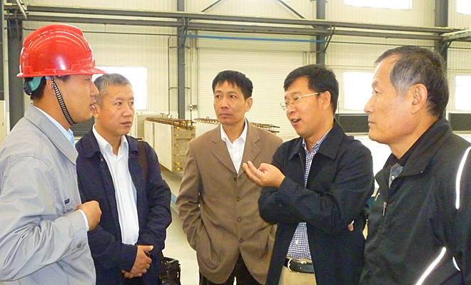 上圖為徐鵬強董事長(右二)在沈陽工業(yè)化部品生產(chǎn)車間與車間負責人交流