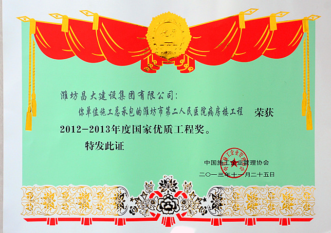 2013年12月27日,中國(guó)施工企業(yè)管理協(xié)會(huì)在北京召開(kāi)“2012-2013年度國(guó)家優(yōu)質(zhì)工程獎(jiǎng)”表彰大會(huì),為獲獎(jiǎng)?wù)哳C獎(jiǎng)。由集團(tuán)第一分公司施工的濰坊市第二人民醫(yī)院病房樓工程獲此殊榮。 國(guó)家優(yōu)質(zhì)工程獎(jiǎng)是我國(guó)工程建設(shè)質(zhì)量方面跨行業(yè)、跨專業(yè)的國(guó)家級(jí)榮譽(yù)獎(jiǎng)勵(lì),已經(jīng)成為政府提倡、社會(huì)知名、企業(yè)向往、專家認(rèn)可、實(shí)踐過(guò)硬的著名品牌,以其權(quán)威性、規(guī)范性、指導(dǎo)性、示范性在工程建設(shè)領(lǐng)域享有崇高的聲譽(yù)。