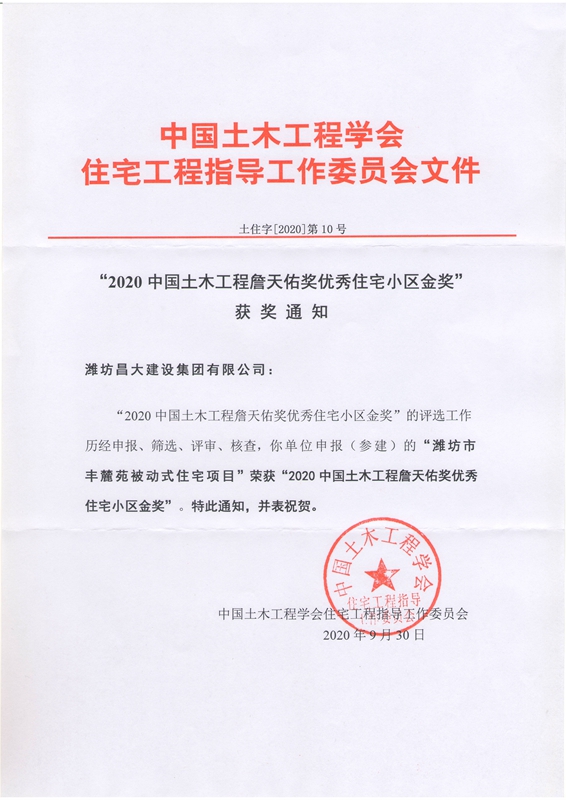 2020年10月12日上午,集團收悉中國土木工程學(xué)會文件“2020中國土木工程詹天佑獎優(yōu)秀住宅小區(qū)金獎獲獎通知”:歷經(jīng)申報、篩選、評審、核查,集團申報的由集團二建公司總承包施工、二安公司參與施工的濰坊市豐麓苑被動式住宅項目榮獲“2020中國土木工程詹天佑獎優(yōu)秀住宅小區(qū)金獎”。 據(jù)悉,這是濰坊歷史上首次獲得這一獎項。恭喜集團,恭喜集團全體員工,并向濰坊全體建筑業(yè)者分享這一榮譽。 附: 申報時間:2020年4月30日; 公示時間:2020年9月23日至30日; 獲獎時間:2020年9月30日。 ![]() |