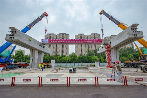 熱烈祝賀集團寶通街快速路工程第一片預(yù)制箱梁順利吊裝完成