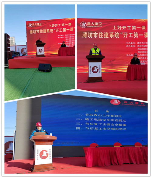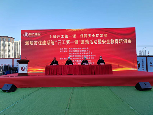 2023年2月15日上午,濰坊市住建系統(tǒng)“開工第一課”啟動活動暨安全教育培訓會議在集團八建公司高創(chuàng)·水緣灣項目現(xiàn)場舉行。濰坊市住建局黨組書記、局長鐘光文,濰坊市建筑業(yè)發(fā)展服務(wù)中心主任許增賢,高新區(qū)住建局局長牟軍生等出席活動。集團公司總裁朱九洲,副總裁楊成國出席并全程參與活動。各縣市區(qū)住建局主要負責人、分管負責人,相關(guān)業(yè)務(wù)科室負責人;房地產(chǎn)開發(fā)企業(yè)、建筑施工企業(yè)、 監(jiān)理企業(yè)分管安全負責人,集團安全生產(chǎn)部、各基層公司安全總監(jiān)、安全生產(chǎn)部全體人員共約200余人參會。