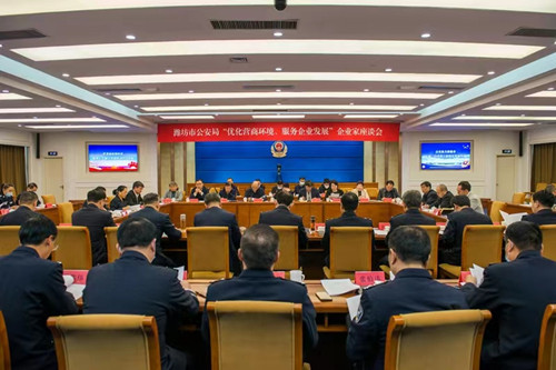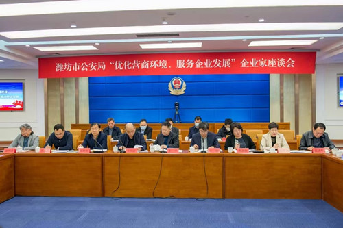 2023年3月22日下午,濰坊市公安局企業(yè)家座談會在市公安局北樓二樓電視電話會議室舉行。濰坊市副市長、市政府黨組成員、市公安局黨委書記、局長、督察長徐磊,濰坊市委統(tǒng)戰(zhàn)部副部長、濰坊市工商聯(lián)黨組書記徐鳳徽,濰坊市公安局在家領(lǐng)導(dǎo)班子,濰坊市各領(lǐng)域重點企業(yè)負責人,市公安局指揮中心、政治部等有關(guān)部門主要負責同志出席會議。會議通報了去年以來市公安機關(guān)有關(guān)工作情況,解讀近期市公安局出臺的服務(wù)企業(yè)相關(guān)文件,聽取了與會同志對公安機關(guān)服務(wù)企業(yè)的相關(guān)需求和意見建議,徐磊副市長講了話。會上,集團公司董事長徐鵬強對一直以來公安系統(tǒng)為企業(yè)發(fā)展營造的良好環(huán)境表示感謝,對廣大公安干警落實治安防范措施、加大掃黑除惡力度;嚴厲打擊經(jīng)濟犯罪、挽回經(jīng)濟損失;交通運輸中的指導(dǎo)服務(wù);網(wǎng)警部門高效的輿情管控等諸項工作中的辛勤付出表示真誠謝意。并希望繼續(xù)加強警企共建,共同攜手抓穩(wěn)定、?保平安、促和諧,在全市拼經(jīng)濟、搞建設(shè)、抓發(fā)展中做出更大的貢獻。