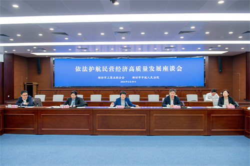2024年2月29日上午,濰坊市依法護(hù)航民營(yíng)經(jīng)濟(jì)高質(zhì)量發(fā)展座談會(huì)在濰坊市中級(jí)人民法院會(huì)議室召開。市政府副市長(zhǎng)、市工商聯(lián)主席陳端梅,市委統(tǒng)戰(zhàn)部副部長(zhǎng)、市工商聯(lián)黨組書記劉興成,市工商聯(lián)黨組成員副主席譚述霞出席會(huì)議。市委政法委、市工商聯(lián)相關(guān)工作人員,商會(huì)會(huì)長(zhǎng)代表、企業(yè)家代表、民營(yíng)企業(yè)法務(wù)中心代表參加會(huì)議。集團(tuán)公司總裁朱九洲出席會(huì)議并作交流發(fā)言,代表企業(yè)家感謝市中院及法院系統(tǒng)在依法護(hù)航企業(yè)發(fā)展過程中給予的支持,同時(shí)建議法院系統(tǒng)繼續(xù)依法對(duì)民營(yíng)企業(yè)提供法律保護(hù)等。