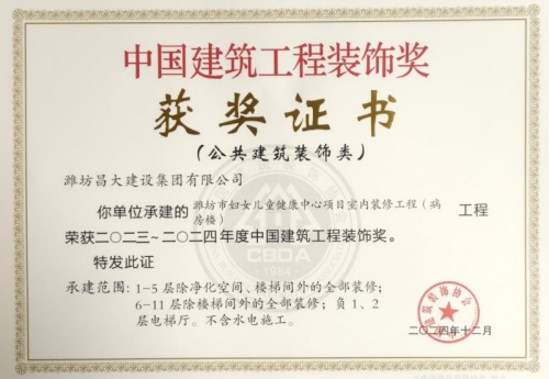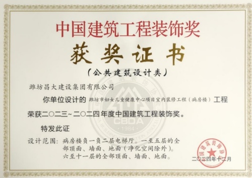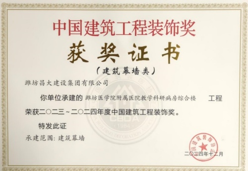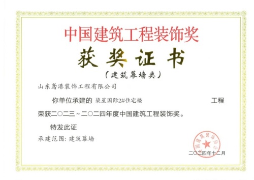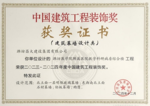 2024年12月10日,中國(guó)建筑裝飾協(xié)會(huì)在北京召開(kāi)大會(huì),表彰2023~2024年度“中國(guó)建筑工程裝飾獎(jiǎng)”工程。集團(tuán)裝飾幕墻工程公司、山東鳶港裝飾工程有限公司的三項(xiàng)工程榮獲五個(gè)獎(jiǎng)項(xiàng):濰坊醫(yī)學(xué)院附屬醫(yī)院教學(xué)科研病房綜合樓(建筑幕墻類(lèi)和幕墻設(shè)計(jì)類(lèi))、濰坊市婦女兒童健康中心病房樓(公共建筑裝飾類(lèi)和公共建筑裝飾設(shè)計(jì)類(lèi)),柒星國(guó)際2#住宅樓(建筑幕墻類(lèi))。