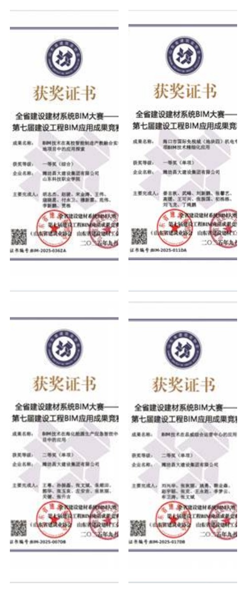 一則是,由山東省建筑業(yè)協(xié)會(huì)與山東省建設(shè)建材工會(huì)聯(lián)合舉辦的2025年第七屆建設(shè)工程BIM應(yīng)用成果競賽公布了獲獎(jiǎng)名單,集團(tuán)公司組織申報(bào)的4項(xiàng)成果全部獲獎(jiǎng),其中一等獎(jiǎng)2項(xiàng)、二等獎(jiǎng)2項(xiàng)。
